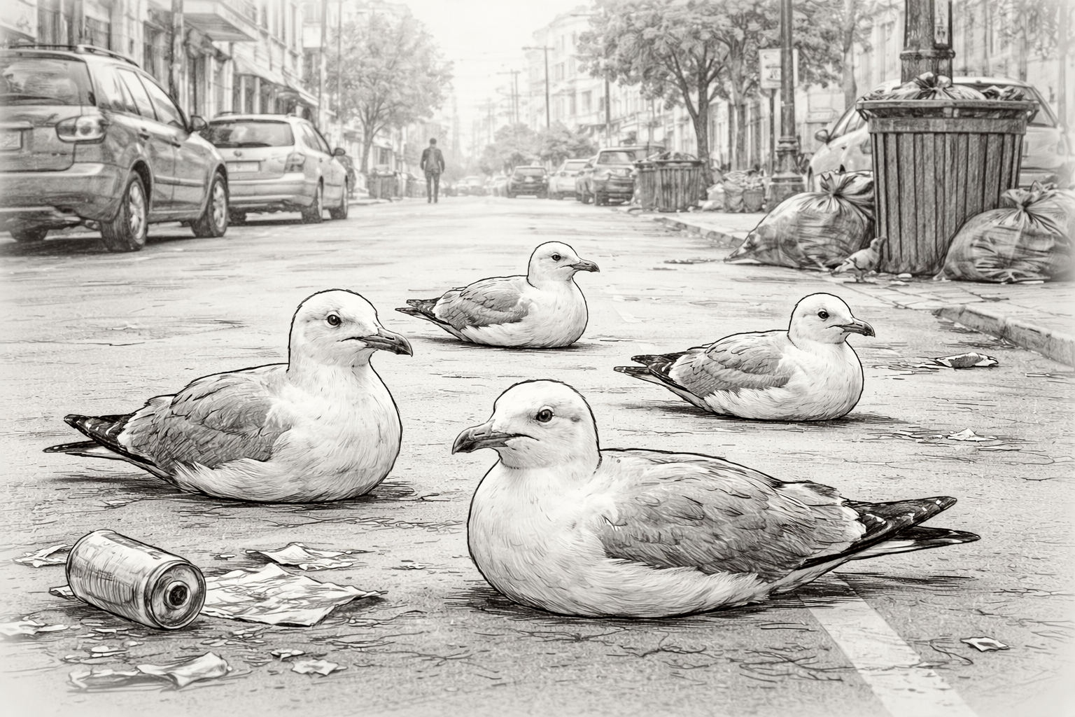 Soon all the birds left in the street were lifeless and limp. Twisted in unnatural positions. Surrounded by feathers and waste.